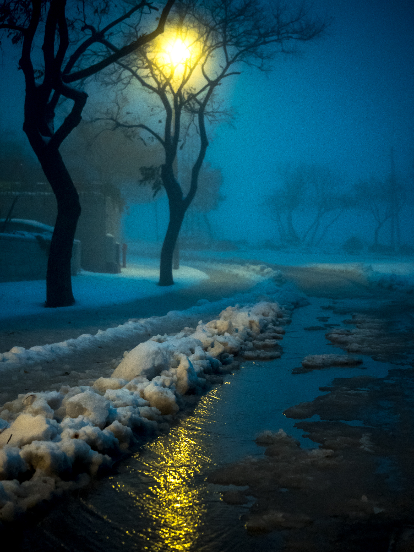 After moving from the windy city of Chicago and growing up with way below zero wind chill temperatures, I thought the cold wouldn’t bother me. Living in Gush Etzion, the cold does bother me, BUT, on the other hand, once in a while I am presented with the rare opportunity of those of us living in Isreal of experiencing snow! I brave the cold and I go out early to capture the clean carpets of white. This image presented itself at the very early morning of my walk – keeping my hands warm until I had to press the shutter. The mysterious glow with the reflection and the snow is still intriguing.